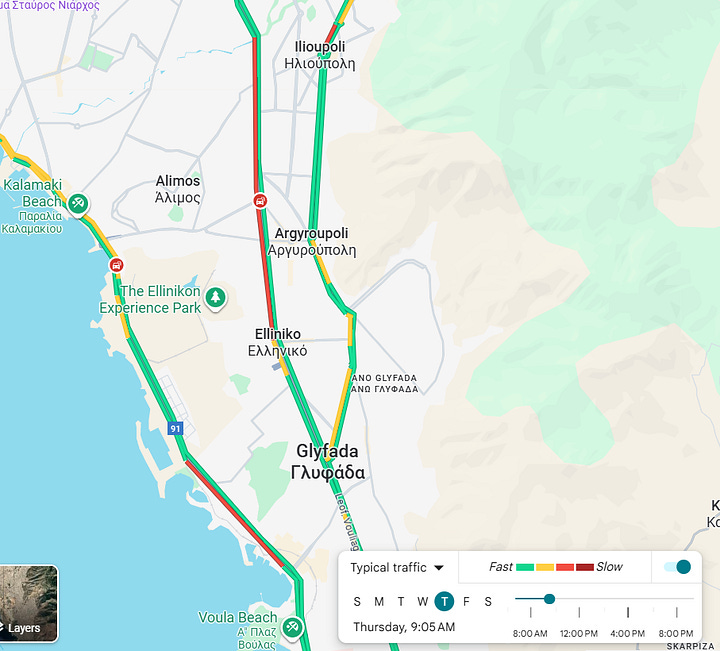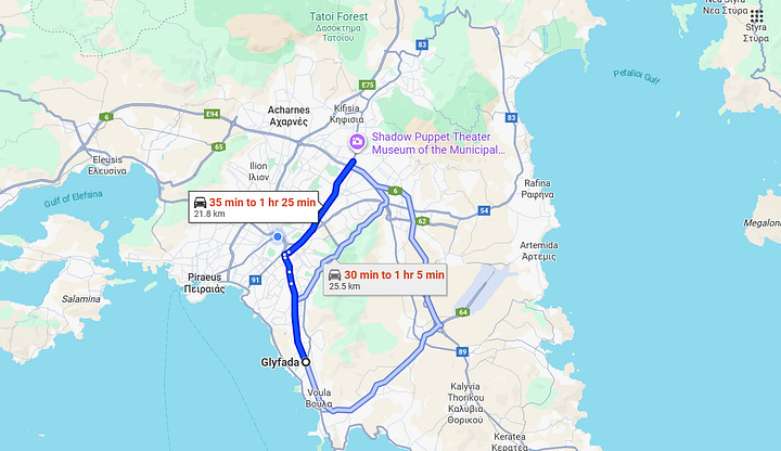 Η εικόνα είναι πολύ χειρότερη αν προσπαθήσει να υπολογίσει κανείς την διαδρομή Γλυφάδα-Μαρούσι, μια απόσταση 22χλμ περίπου, στην οποία το ΙΧ χάνει όποια πλεονεκτήματα έχει έναντι των ΜΜΜ, ακόμα και αν περάσει από τα διόδια της Αττικής οδού στην περιφερειακή Υμηττού. Ενας οδηγός στις οκτώμισι το πρωί θα αντιμετωπίσει συμφόρηση σε όλη τη Βουλιαγμένης και στη συνέχεια στην Κηφισίας, από το ύψος του Ψυχικού.