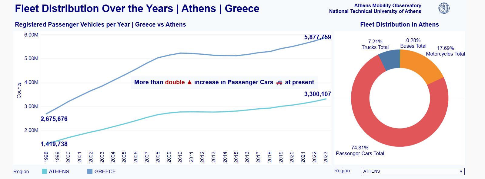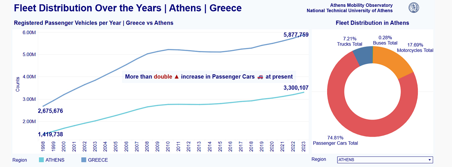 Σύμφωνα με την Περιφέρεια Αττικής, ο στόλος των αυτοκινήτων σήμερα στο Λεκανοπέδιο αριθμεί τα 3,5 εκατομμύρια οχήματα, οι μοτοσυκλέτες υπολογίζονται σε 720.000 και τα ταξί σε 14.000.