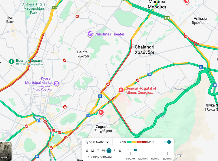 Πρωινή Αιχμή (Αναχώρηση 08:30) - 45 - 70 λεπτά (50 λεπτά τις περισσότερες φορές σύμφωνα με την περιφέρεια Αττικής)