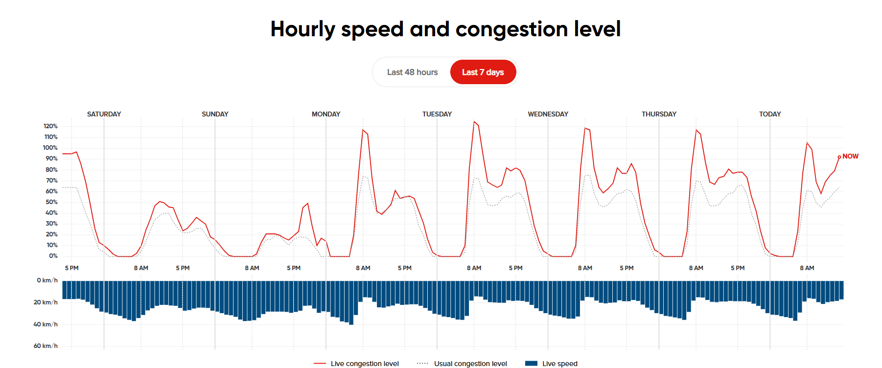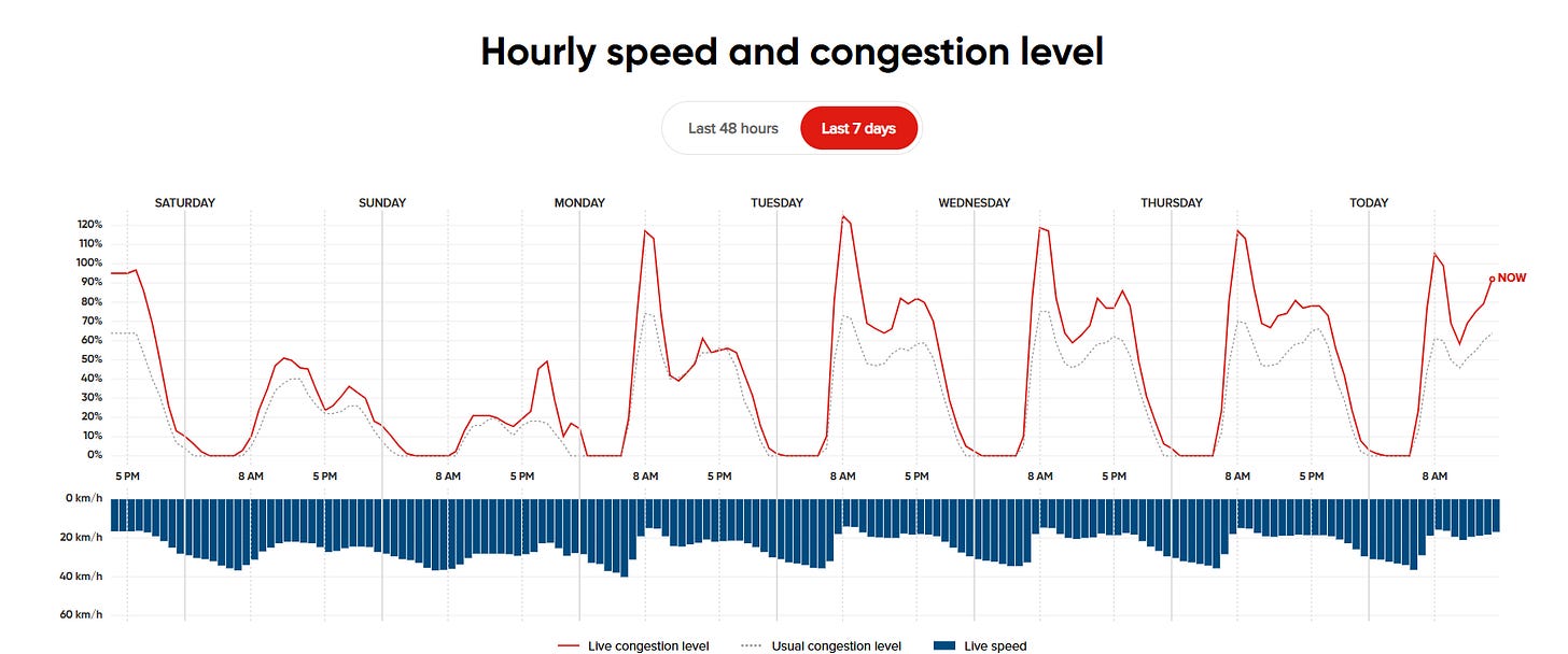Η παρατήρηση που βγαίνει αβίαστα είναι ότι είναι πρακτικά αδύνατον να προγραμματιστεί μια διαδρομή μέσα στην πόλη με ακρίβεια, η δε διαδρομή από το ένα άκρο στο άλλο ισοδυναμεί με ταξίδι εκτός πόλης. Επιπλέον, τη εξαιρέσει έκτακτων γεγονότων, η τυπική καθυστέρηση σε ώρες αιχμής είναι σταθερά πάνω από το 100% του χρόνου ελεύθερης ροής. Η μέση ταχύτητα στα τμήματα με το μεγαλύτερο πρόβλημα πέφτει κάτω από τα 15 χλμ/ώρα.